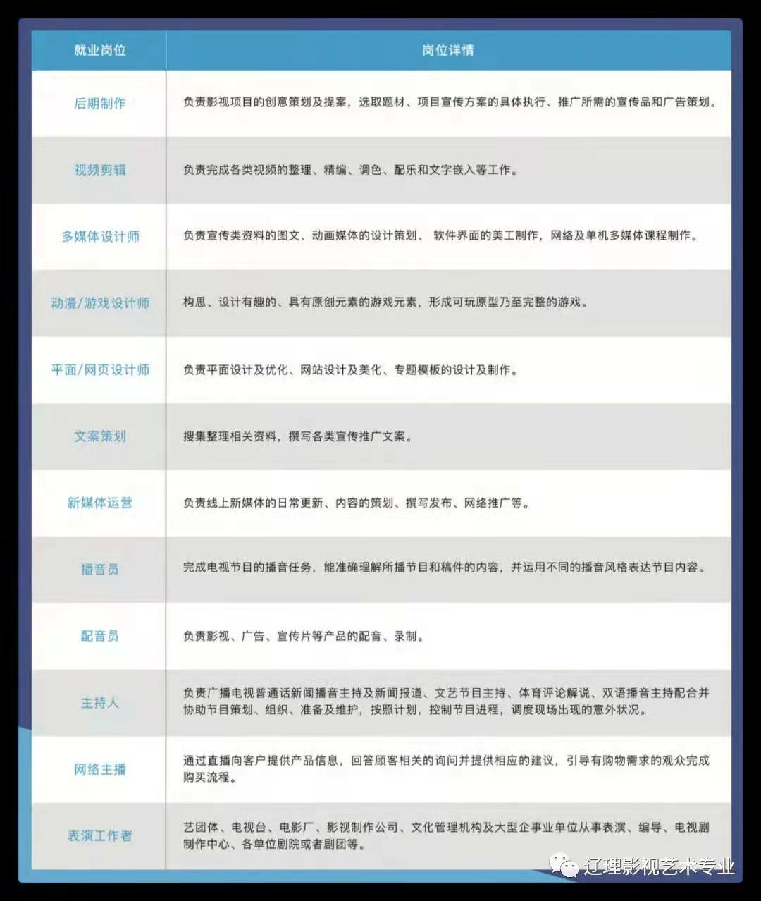 毕业进入各影视公司、传媒公司、经纪公司、影视制作公司、单位剧院或者剧团、电影制片厂、电视剧制作中心、影视节目制作公司、广告公司、各级电视台、综艺节目方向、新闻媒体、报社杂志期刊社、出版社、文化宣传部门、国家机关等相关企事业单位从事影视表演、话剧表演、节目主持、网络主播、配音、导演、编导编辑、策划、管理、摄像、特效、动画、剪辑、人物造型、化妆、经纪管理、模特等相关岗位。